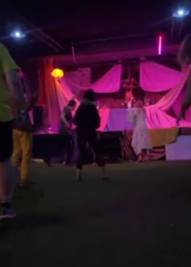 lively scene with a small crowd gathered around a stage area. The stage is decorated with pink and cream-colored fabric draped over what looks like a stone wall facade. A DJ with long reddish hair is visible behind the stage, presumably playing music. Several people are in front of the stage: one is wearing a black outfit and dancing barefoot, another person in a blue-green robe is taking pictures with their phone, and others are milling about in the background, including one person in a bright yellow shirt. The flooring appears to be artificial grass. The lighting is mostly dark, with pink spotlights shining on the stage. The overall atmosphere is that of a party or performance event.