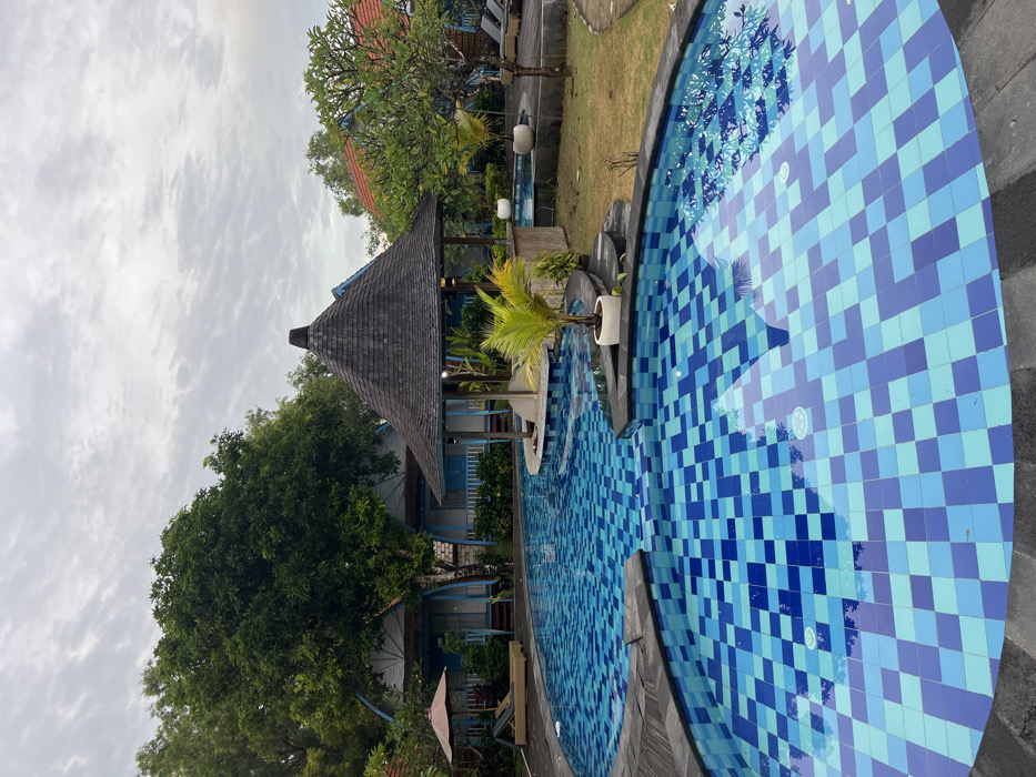 A tranquil outdoor scene features a rounded swimming pool tiled in shades of blue. Adjacent to the pool is a Balinese-style gazebo with a dark, pointed roof and light blue pillars. Lush green trees and vegetation surround the pool area. The sky above is overcast with muted light, creating a serene and peaceful ambiance.
