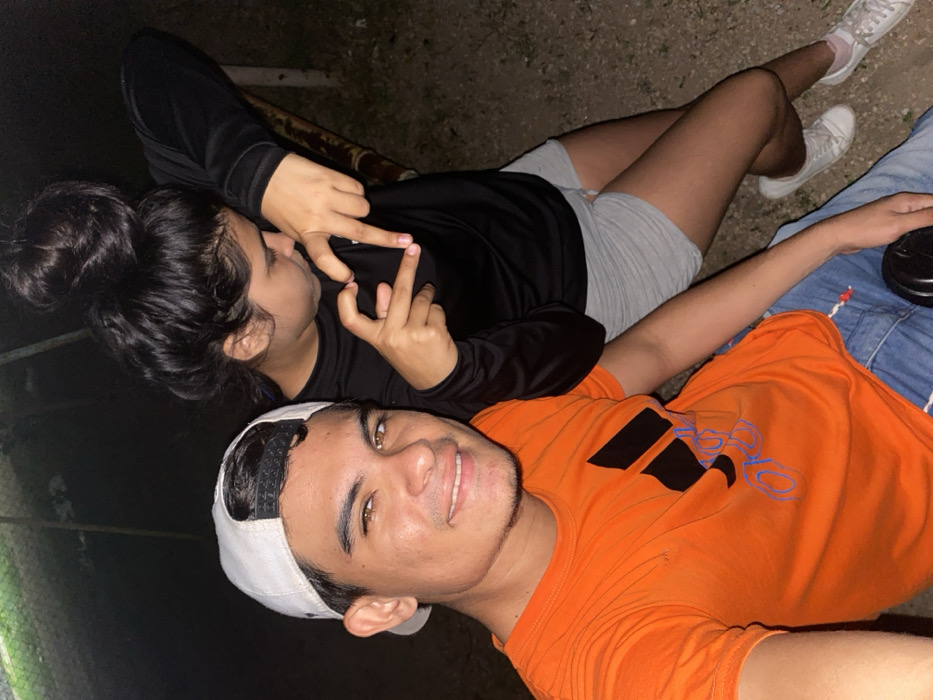 A selfie captures a young couple outdoors at night. The man, wearing an orange Adidas t-shirt and a white cap, lies at the bottom of the frame with a slight smile. A woman with her hair in a bun is above him, making hand gestures with both hands, one with the middle finger extended, the other as a peace sign. She wears a black shirt and grey shorts, with white sneakers visible in the background. The background features dirt or grass, and a partially visible rusty pipe.