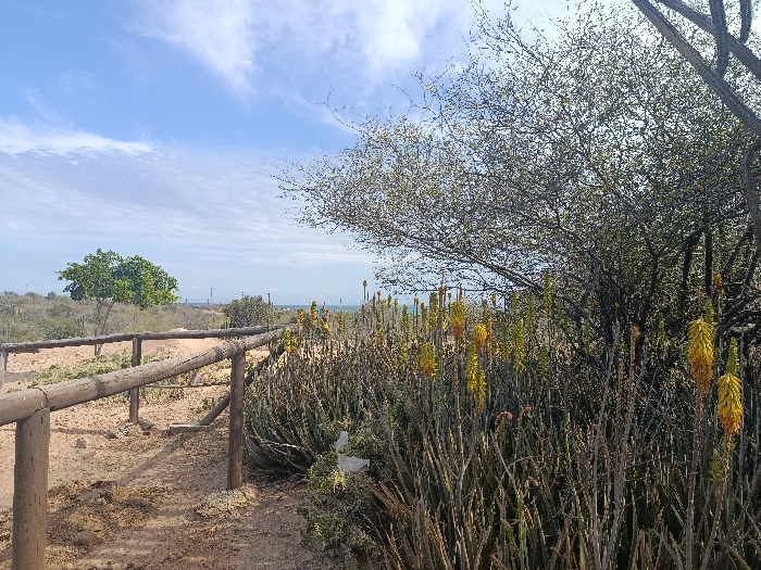 The image depicts a static outdoor scene in Guayacancito, Venezuela, under a partly cloudy sky. The foreground and midground are dominated by natural elements. To the right, dense vegetation includes numerous stalk-like plants, identifiable as succulents, bearing erect yellow-orange, conical flower clusters. A large, bushy tree with sparse green foliage and dark branches rises behind these plants. The ground in this area is dry, sandy soil. To the left, a rustic wooden fence, constructed from debarked logs forming vertical posts and horizontal rails, runs parallel to a clear dirt or sand path that extends into the midground. Beyond the foreground, the midground contains scattered green scrub vegetation and a prominent, full-canopied green tree on the left. In the distant background, several tall, slender vertical structures, consistent with utility poles or communication towers, are visible against the horizon. The horizon line also reveals a body of water, appearing as a light blue strip, likely the sea. The sky above is light blue with scattered white, wispy clouds. No individuals or animals are present within the frame.