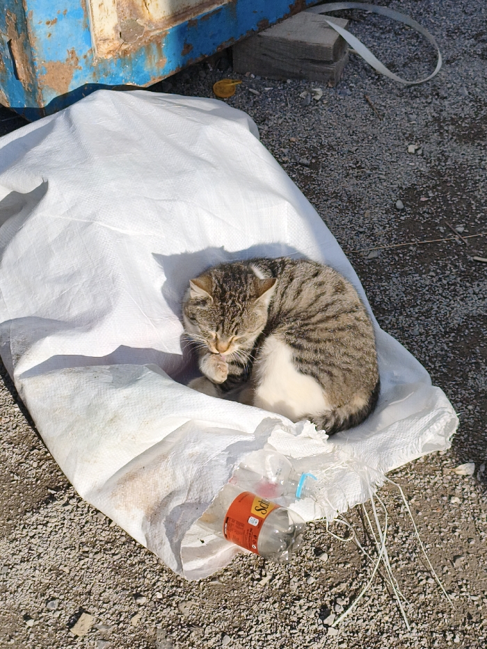 The image displays an outdoor scene in Zlatitsa, Bulgaria, under direct sunlight. A domestic tabby cat, characterized by brown and grey stripes and white fur on its underside, is observed curled and resting on a large, flattened white woven polypropylene bag. The cat's head is lowered, eyes appear closed, and its right front paw is raised to its mouth, indicating grooming activity. A distinct shadow of the cat is cast on the white bag. Adjacent to the cat, within a fold of the bag, a clear plastic bottle with an orange label, partially obscured, is visible. The ground surrounding the bag is composed of gravel and dirt. In the upper left quadrant of the image, a section of a heavily rusted blue metal container, consistent with a dumpster, is present. A dark wooden block is situated beneath the container, and a white plastic strap, along with a small yellow plastic object, are visible on the gravel near the container.