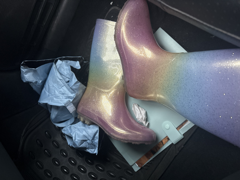 The image displays a collection of items situated within the interior of a vehicle, consistent with a car's passenger compartment. The specific city or country, including Puebla, Mexico, cannot be determined from the visual evidence. The central subjects are a pair of children's rain boots, translucent and infused with glitter, exhibiting a color gradient from light blue-purple at the lower shaft to pink-yellow towards the upper cuff. One boot is oriented diagonally with its toe pointing towards the upper left, while the other boot's lower portion is visible, pointing towards the lower right. Beneath the boots, a light blue-green rectangular object, consistent with a clipboard or thin folder, is present. This object features a light blue plastic clip mechanism on its left side, under which a brown and white striped item is secured. A small, crumpled piece of white paper rests on the blue-green object, positioned between the two boots. In the upper left area of the frame, a crumpled light blue plastic bag or packaging material is discernible. The floor surface upon which these items rest is covered by a black rubber car mat, characterized by a textured pattern of raised oval indentations. Dark-colored upholstery and plastic components of the vehicle interior are visible in the background, primarily on the right side and upper periphery of the image. No individuals are present, and no active interactions are depicted.
