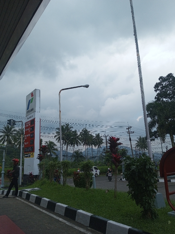 The image depicts an outdoor scene in Sandamal Eliya, Sri Lanka, under an overcast sky. A prominent vertical sign for "PERTAMINA," featuring a blue 'P' and a red flame/leaf logo, stands on the left. The sign displays digital numbers, including "34.815.0" and other text related to fuel types and prices, and a "CCTV" indicator. In the foreground, a black and white striped curb separates a paved area, which is partially red, from a grassy median containing various green shrubs and plants with reddish foliage. On the paved area to the far left, a person wearing a dark top, dark trousers, and a red helmet is walking towards the right, away from the viewer. Beyond the grassy median, a road is visible. A white utility truck is partially obscured by vegetation, and a motorcycle with a rider is visible further down the road, heading away. The mid-ground features several tall palm trees, utility poles, and numerous overhead power lines traversing the frame horizontally. Two streetlights are present: one bent, rusty pole with a fixture closer to the Pertamina sign, and another taller, thinner pole further to the right. In the background, a range of hills or mountains is faintly visible beneath the cloudy sky.