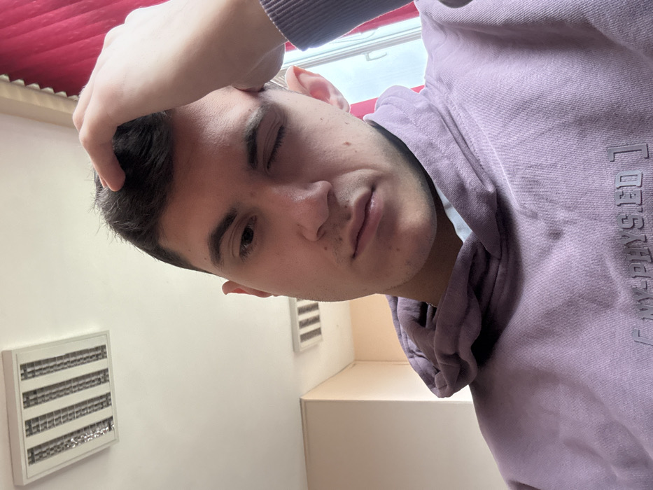 An indoor portrait-oriented image depicts a young adult male positioned slightly off-center, looking towards the viewer