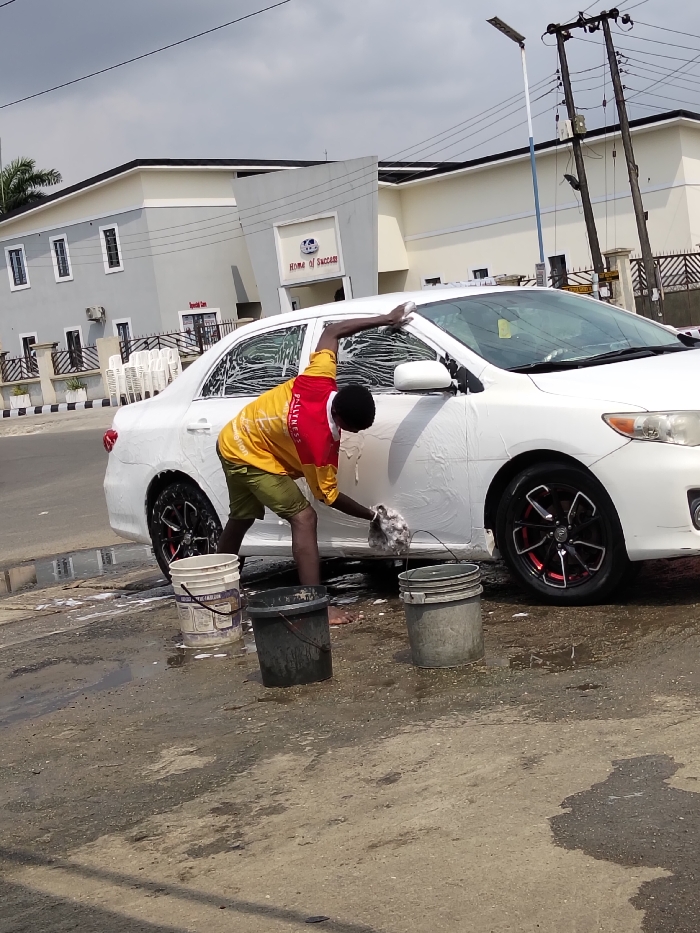 A male individual is observed washing a white four-door sedan on a paved street in Port-Harcourt, Nigeria, in front of the "Home of Success" building, located at 24 Chief Wopara Street, Rumuigbo