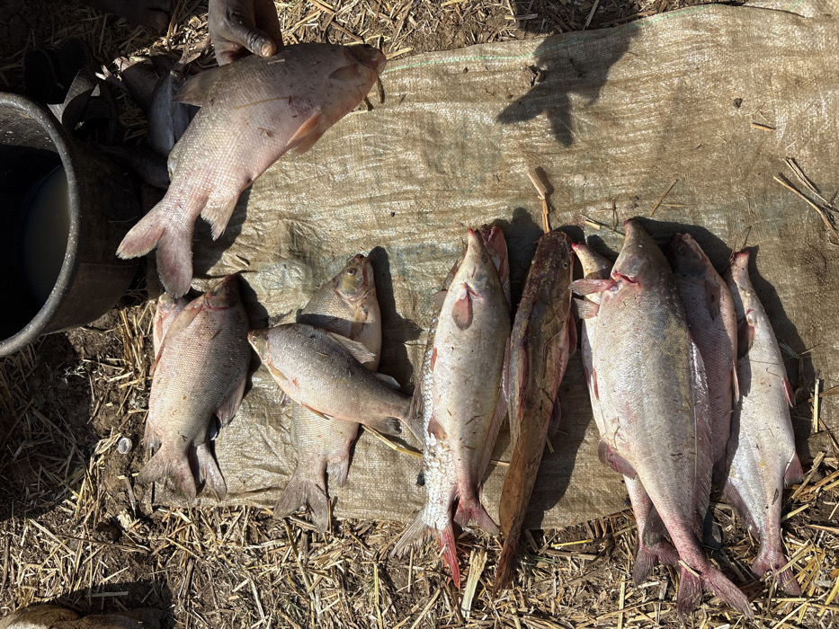 The scene depicts an outdoor fish display in Kokani North, Nigeria, under direct sunlight. Approximately 20-25 freshly caught fish of varying species are laid out on a light brown woven tarp spread over dry, earthy ground mixed with straw and plant debris. A dark-skinned hand is visible in the upper right quadrant, holding a large, silver-scaled fish, likely for inspection or display. This fish exhibits minor scale damage and visible red coloration around its gills. Other fish visible on the tarp include: * A group of smaller to medium-sized, silver-scaled fish, possibly cichlids, clustered in the upper and middle-left areas. * Two larger, elongated, silver-scaled fish with prominent reddish fins in the mid-bottom section. * A single, dark-colored, elongated, scaleless fish resembling a catfish, with visible barbels, positioned below the elongated silver fish. * A cluster of 4-5 large, robust, silver-grey fish with somewhat pointed heads and reddish fins are arranged at the bottom of the frame. * Some fish show evidence of blood near their gills or fins. In the upper right corner, a dark-colored bucket or basin containing murky liquid is partially visible. A white plastic cap lies on the ground near the upper-left fish. Sharp shadows, including that of the hand, indicate strong overhead illumination.