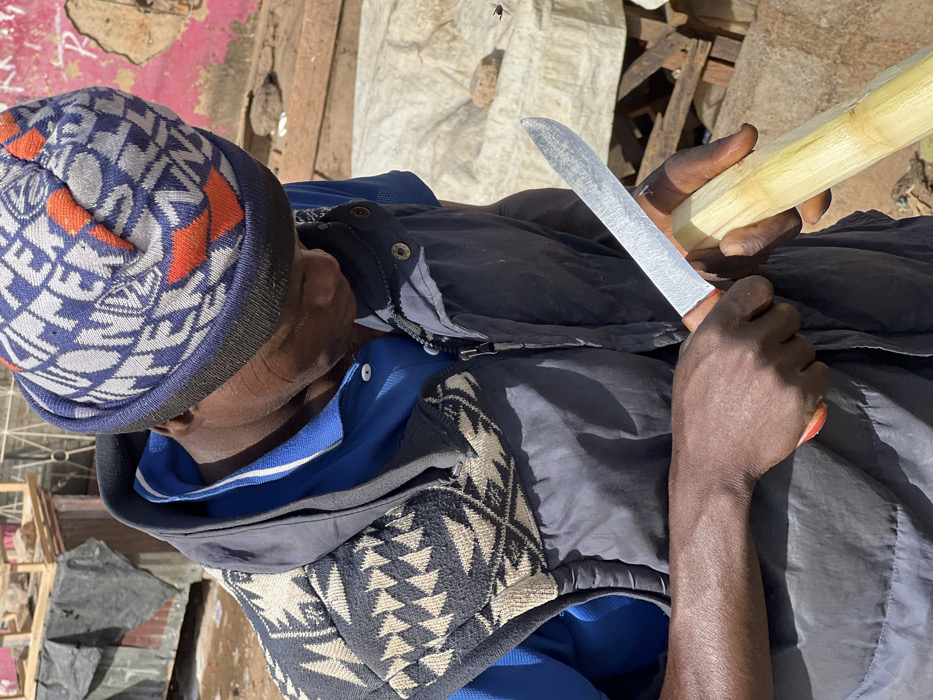 An outdoor close-up depicts a dark-skinned male in Gwong, Nigeria, actively peeling a segment of sugarcane