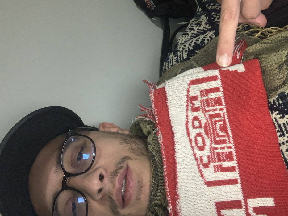 A person wears glasses, a black hat, and an olive green jacket. He holds up a red and white knit scarf with fringe edges. The scarf appears to have a logo or text on it, but the text is not clear. The person is looking at the camera and smiling. In the background, there is a light-colored wall and a chair with various patterned textiles. A finger points at the scarf.