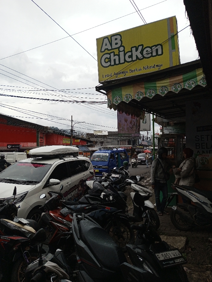 This image captures a bustling street scene, specified as occurring in the city of Melakudikadu, India, under an overcast sky. Numerous overhead utility lines crisscross the frame from left to right. In the immediate foreground, multiple motorbikes and scooters are parked on asphalt, some appearing damp. A black motorbike features a license plate reading "F 5851 WAH" and a partial "SAMURAI" decal. To the left, a white minivan or SUV with a white roof cargo box is parked. Behind it, a red-walled building is visible. In the midground, traffic moves along a two-lane road. A blue utility van drives alongside several motorbikes whose riders wear helmets. Further down the street, a lone pedestrian is visible. To the right, the entrance of a commercial establishment is partially obscured by shadow. Above, a prominent yellow sign displays "AB Chicken" in dark green letters, with the slogan "Lezat Agamanya, Berkah Nikmatnya" (Indonesian for "Delicious in its faith, blessed in its enjoyment") underneath. Below the sign, a scalloped awning in green, light green, and orange hues extends over the sidewalk. Under the awning, two individuals are interacting; one, wearing a grey hooded jacket and dark pants, faces away from the camera, while the second, wearing a light-colored jacket and head covering, faces the first, holding a small object in their hand.