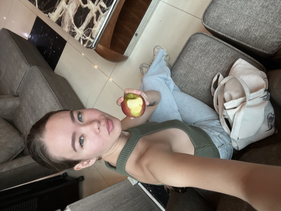 A young woman takes a selfie while holding a partly eaten apple. She wears a green tank top and light blue jeans while sitting on a gray couch. A white tote bag rests beside her. The background features a black-and-white tiled floor and a dark wood table. The image is slightly tilted, adding a casual, candid feel.