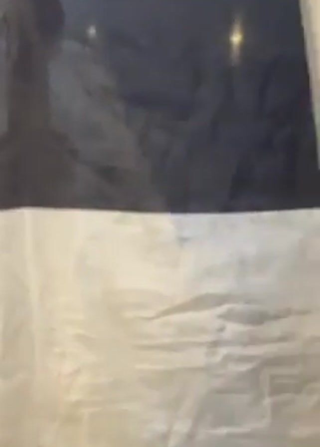 A large Palestinian flag, with horizontal black, white, and green stripes and a red triangle on the left, is being held aloft. In the background are blurry figures, possibly other people or structures. The overall setting appears to be a gathering or protest.