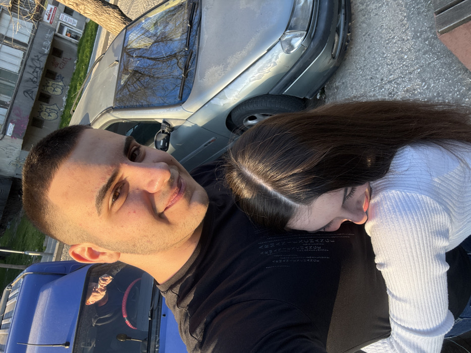 A daytime outdoor image captures two young individuals in an embrace. A male subject, positioned closer to the camera, has short dark hair and a light complexion, wearing a black t-shirt with "ARMANI EXCHANGE" text. He is smiling. A female subject, with long dark hair and a light complexion, is embracing the male, with her head resting on his chest/shoulder, facing away from the camera. She wears a white ribbed long-sleeved top. Behind the subjects, a blue vehicle is partially visible on the left, reflecting a person's hands on a steering wheel. To the right, a light grey sedan, identifiable as a Peugeot 406 with faded paintwork, is parked. Its windshield reflects bare tree branches and a blue sky. In the background, a multi-story building with a light-colored, aged facade is visible. The building displays graffiti, including "BLACK" and "GLCK". A sign prominently featuring "МЕДИКА МИДО" (Medica Mido) is affixed to the building, specifically identifying the location as Plovdiv, Bulgaria, corresponding to a pharmacy at ul. "Hristo Botev" 131. Green grass is visible on a slight incline behind the parked vehicles. The foreground consists of a paved surface. The scene is illuminated by direct sunlight, casting noticeable shadows.