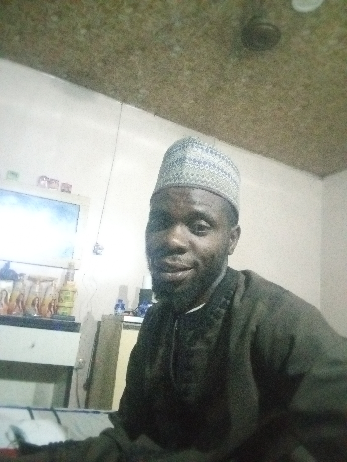 A man with dark skin, a neatly trimmed beard, and a patterned kufi stands indoors. He is wearing a dark-colored robe with embroidery around the collar. Behind him is a dresser with several pictures on top, along with a water bottle. A ceiling fan and a patterned ceiling are visible above. The wall is a light shade of off-white.
