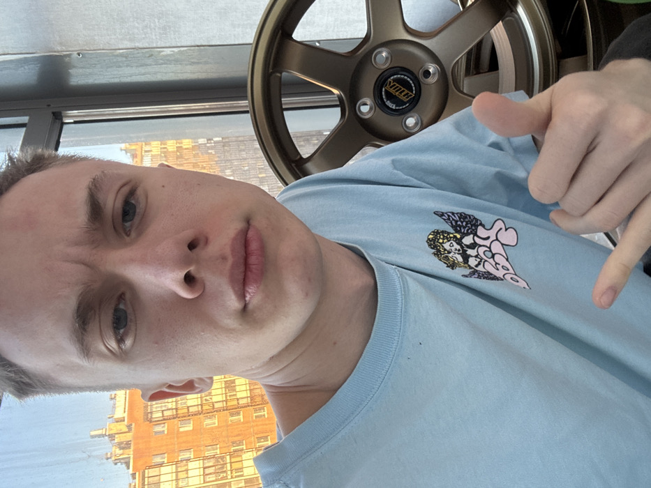 A young adult male, with short, light-colored hair and blue eyes, is depicted in a close-up, selfie-style image taken indoors in Murino, Russia. He wears a light blue short-sleeved t-shirt featuring a graphic of two cherubs intertwined with pink cloud-like shapes and text on the left chest. His expression is neutral with a slightly furrowed brow. His right hand, partially visible in the lower right, forms a "shaka" or "hang loose" gesture (thumb and pinky extended). To the right of the subject, a bronze-colored multi-spoke automotive alloy wheel is prominently displayed, showing a black central cap with "WORK EMOTION" branding. In the background, visible through a large window, is an urban landscape of Murino, Russia, with several multi-story buildings, primarily light orange/brown in color, illuminated by warm, low-angle sunlight.