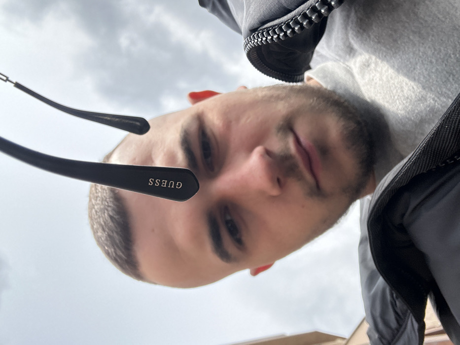 A close-up, upward-angled image features a young adult male outdoors in Plovdiv, Bulgaria. The background consists primarily of an overcast sky, with a pale, vertical architectural element partially visible on the extreme left. The subject is a light-skinned male with a short buzz cut and facial stubble, gazing directly into the camera. His right ear is partially visible, appearing red. The black temples of "GUESS" brand sunglasses are prominently visible in the upper frame, angled downwards, situated above the subject's forehead. He wears a grey crew-neck garment beneath a dark zippered jacket.
