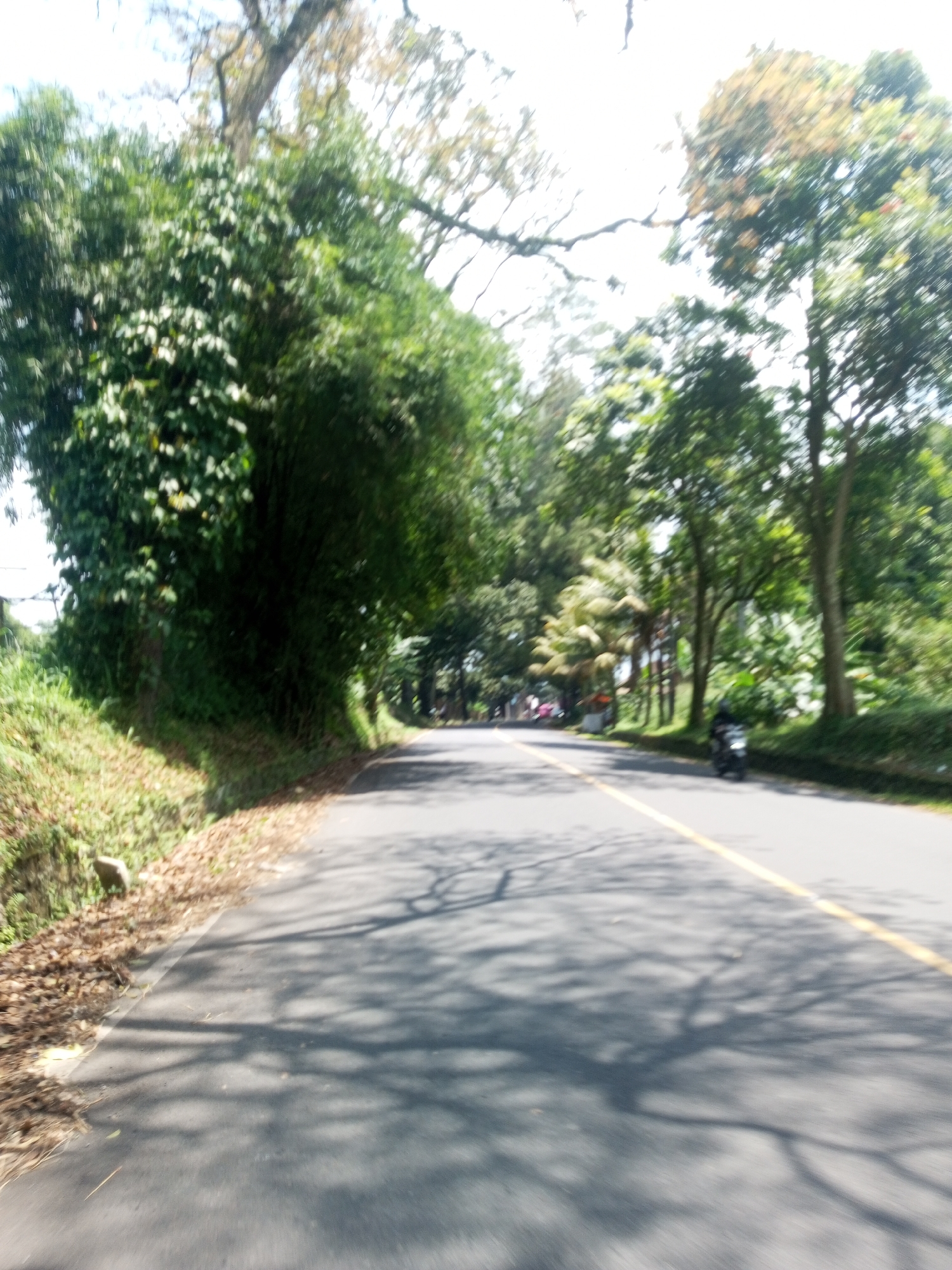 paved road in Nawng Hkar, Myanmar, flanked by dense green trees. A yellow line runs along the right side of the road. Shadows of trees fall across the asphalt. A motorbike is visible on the right side of the road in the distance. Other vehicles are farther ahead.