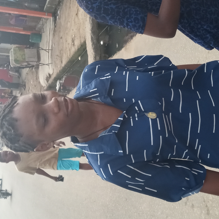 The image depicts a street scene in Umuode, Nigeria. In the immediate foreground, a young adult female with dark skin and dark, short dreadlocks or twists with shaved sides, faces slightly to her right, her gaze directed downwards. She wears a navy blue collared V-neck shirt patterned with horizontal and short vertical white dashed lines. A small silver-colored stud earring is in her left ear, and a dark cord necklace with a golden oval pendant is visible on her chest. Behind her, on a gray paved asphalt road, a young male with dark skin, wearing a light brown t-shirt and light blue shorts, walks away from the camera, holding a dark object in his left hand. To the right of the primary subject, a person's torso and upper arm are visible, clad in a dark blue patterned top. The environment features a concrete drainage ditch filled with murky water running parallel to the road on the right, bridged by a narrow concrete slab. Beyond the ditch, a raised dirt and concrete verge precedes a row of single or two-story buildings with dark-colored facades and metal security shutters. Two light-colored, possibly upholstered, metal-frame chairs and a green plastic jerry can are visible on the verge near the buildings. In the far background on the left, a motorcycle is partially visible on the road. Indistinct figures are scattered further down the street near the buildings. The scene is illuminated by diffused light, indicating possibly overcast conditions.