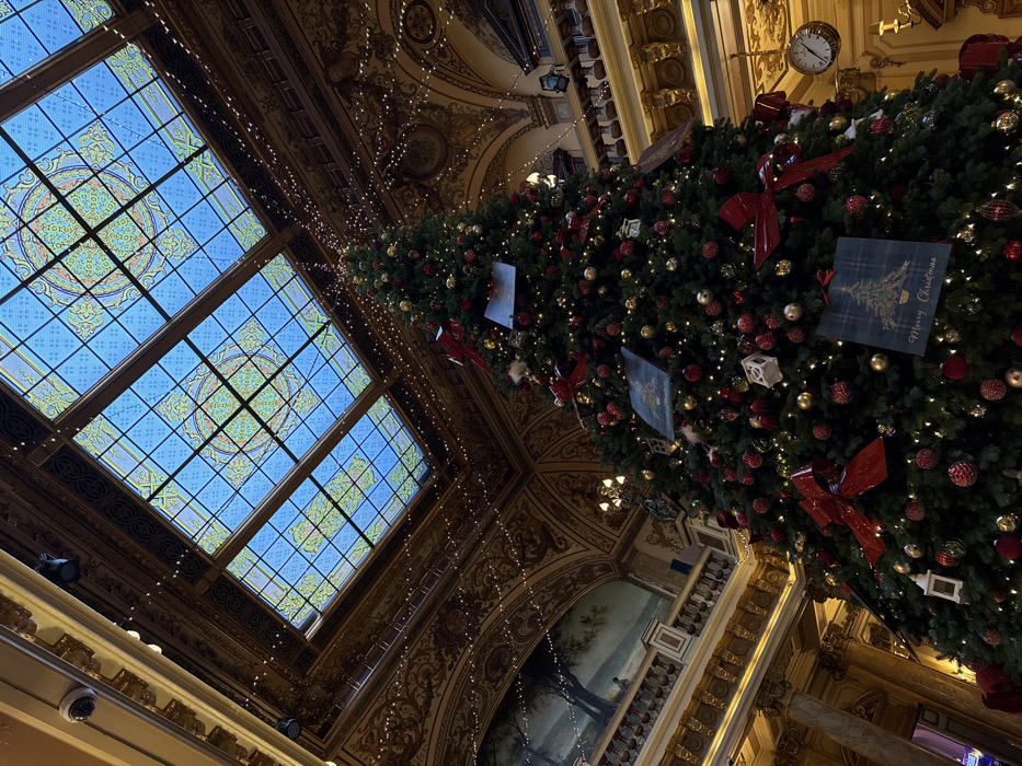 The image displays the ornate interior of the Casino de Monte-Carlo in Monaco, specifically a grand hall. A large, densely decorated artificial Christmas tree stands prominently in the center-right, extending from the bottom to near the top of the frame. The tree is adorned with numerous warm white string lights, red and gold spherical ornaments, large red bows, white lantern-shaped ornaments, and several rectangular, dark blue gift-bag-like decorations, some featuring an image of a Christmas tree and the text "Merry Christmas." Above, an elaborate, high ceiling with intricate gold and brown decorative moldings and carvings is visible. A large, multi-panel stained-glass skylight, featuring a grid pattern with blue, green, and orange geometric and circular designs, dominates the upper center of the ceiling. Numerous delicate string lights are draped across the ceiling and architectural features. Architectural details include an ornate balustrade, possibly part of a mezzanine level, supported by classical columns on the left, and a large wall mural depicting a natural landscape with trees and a lone figure. A white dome security camera is mounted on the upper left ceiling. On the far right wall, a wall clock with a white face and black Roman numerals, indicating approximately 11:55, hangs from a golden bracket. No individuals are present in the scene.