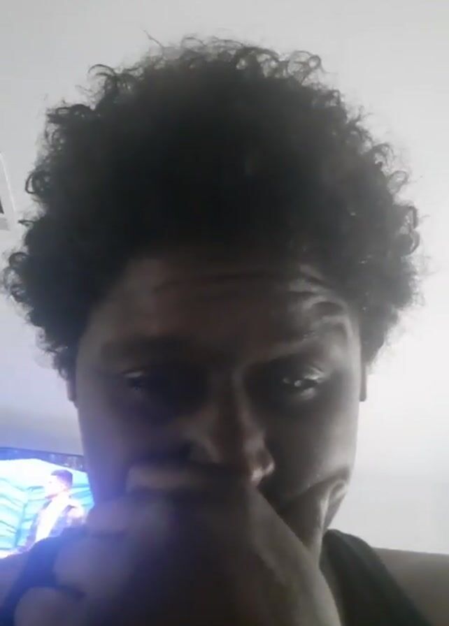 A person with dark skin and curly black hair is holding their hand to their mouth and nose. They remove their hand and point to their eye while speaking. They then smile. A television is visible in the background. The room is white. The person is wearing a black tank top.