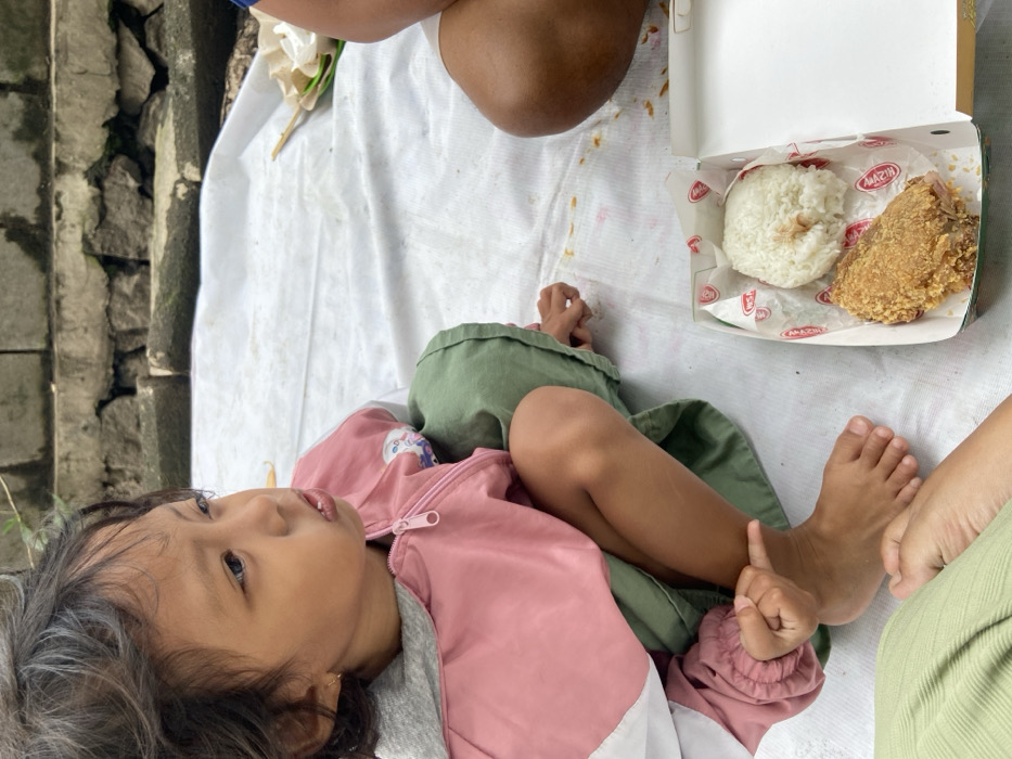 A young child in a pink and green jacket lies on a white cloth outdoors. They are positioned next to a box of rice and fried chicken. An adult's legs are visible near the child. A stone wall is partially visible on the left. The scene suggests a picnic or casual meal being shared outside. The child appears to be lying down, perhaps resting or relaxing during the outing.