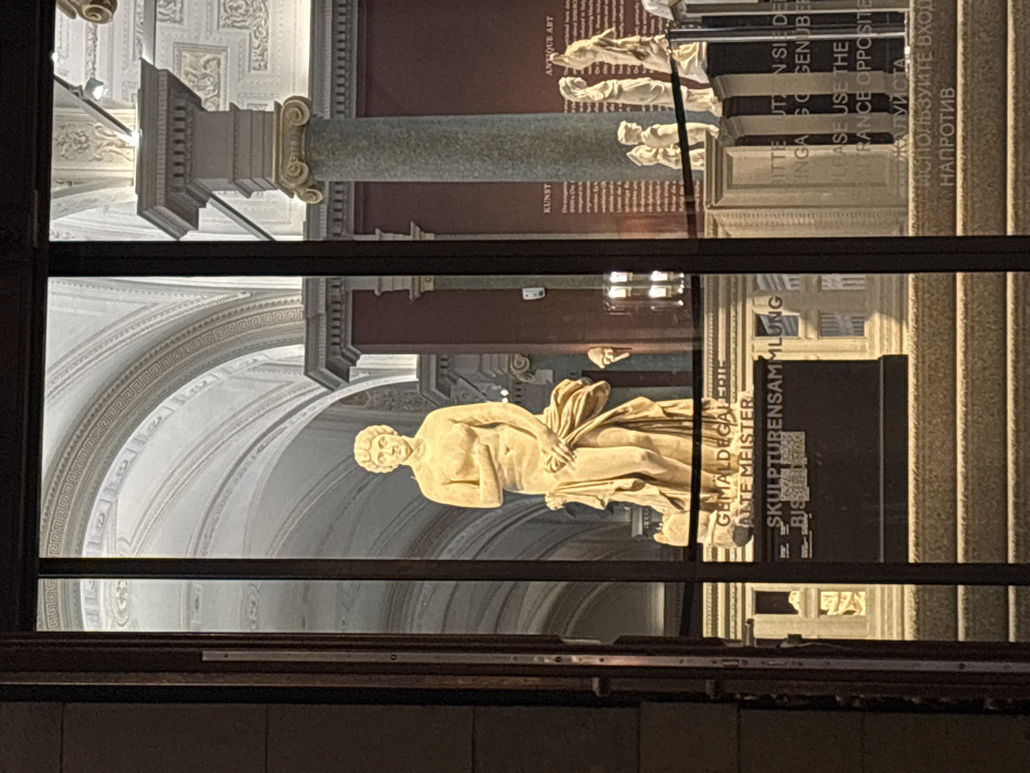 The image depicts the interior of the Sempergalerie, part of the Zwinger Palace in Dresden, Germany, viewed through a window. A prominent, illuminated classical marble statue of a partially draped female figure with short, curly hair stands centrally on a dark rectangular pedestal. Below the statue, text on the pedestal reads "GEMÄLDEGALERIE ALTE MEISTER" and "SKULPTURENSAMMLUNG," with a partial QR code visible. The background features grand, light-colored vaulted ceilings adorned with intricate architectural patterns and classical columns. To the right, a large dark green column with a golden Ionic capital stands against a deep reddish-brown wall. Several smaller classical white sculptures are displayed on pedestals along this wall. Multilingual informational signs, including "KUNST," "ANTIQUE ART," and instructions such as "PLEASE USE THE ENTRANCE OPPOSITE" in German, English, and Russian, are visible on the right. The scene is well-lit, highlighting the artworks and architectural details. The view is slightly obscured by reflections on the window glass, including partial text. Brown steps or a raised platform are visible at the bottom of the frame.