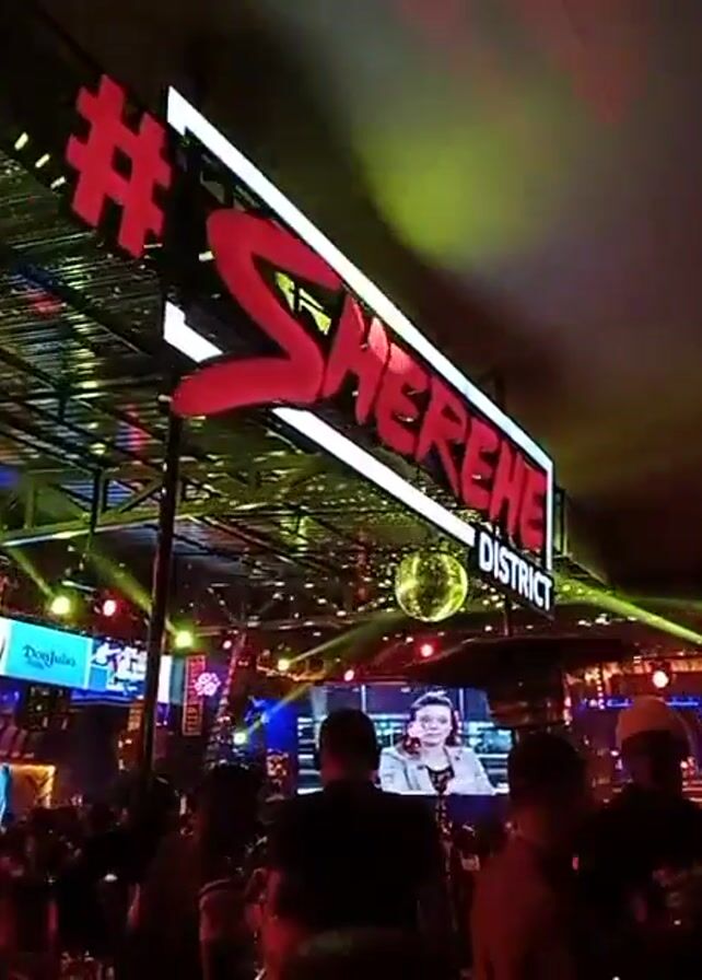 interior of a crowded establishment with the sign "#SHEREHE District" lit up above. There are several screens displaying video footage. The lighting is colorful and varied, with spotlights moving around the space and a disco ball hanging from the ceiling. Many people are present, most of whom appear to be facing the front of the space. The overall atmosphere is lively and festive, suggesting the venue is a nightclub or entertainment venue.