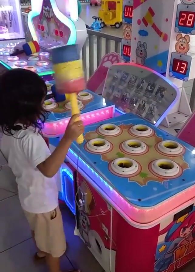 A young child is playing a "Whack-a-Mole" style arcade game. The child, a girl with dark curly hair, wears a white T-shirt and tan shorts and brown sandals. She stands in front of a brightly colored game that has nine holes. The game is illuminated with blue and pink lights. The child swings a large, colorful mallet, attempting to hit the targets as they appear in the holes. Behind her, another game of the same type is visible. In the background is other various arcade games and a toy car. The scene takes place in an indoor arcade setting. The camera remains relatively static, offering a clear view of the child and the game.