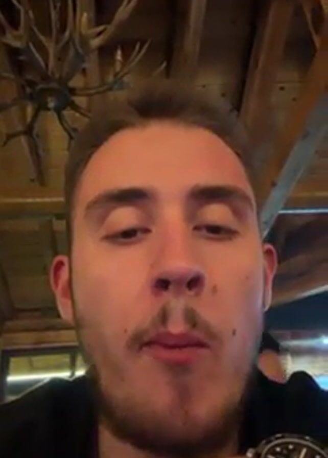 close-up of a young man with a beard and mustache. He is wearing a black shirt and a watch on his left wrist. He is looking directly at the camera with a slightly surprised expression. Behind him, slightly out of focus, another man is standing, holding what appears to be a phone or small camera. The background consists of a rustic wooden ceiling with exposed beams and a chandelier with antlers. The setting appears to be a restaurant or bar with a rustic, possibly hunting lodge-themed decor. There is music playing in the background.