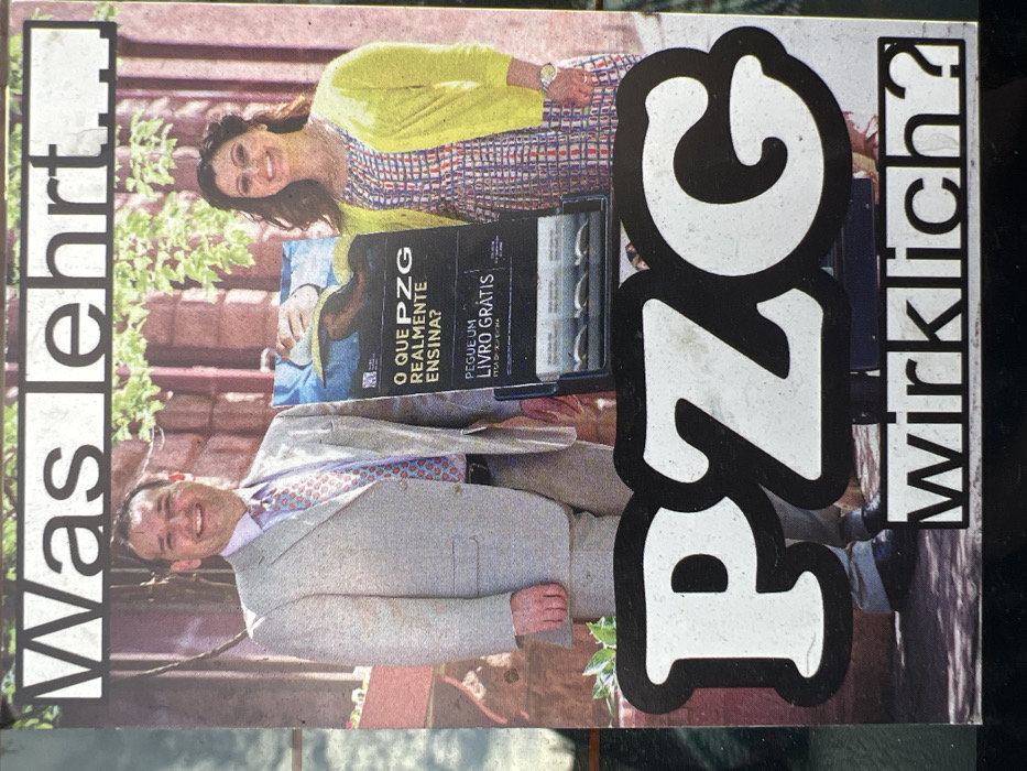 This image is a photograph of a printed poster located in Uccle-Ukkel, Belgium. The poster features two smiling Caucasian individuals standing behind a literature display cart. On the left, a man with short, dark hair wears a light-colored suit, a light shirt, and a patterned tie, smiling directly forward. To his right, a woman with long, dark, wavy hair wears a patterned dress and a bright yellow cardigan, also smiling directly forward. She wears a watch on her left wrist. Between them, a dark-colored literature display cart holds multiple booklets. A sign on the cart displays an image of hands holding an open book, along with Portuguese text: "O QUE PZG REALMENTE ENSINA?" (What does PZG really teach?) and "PEGUE UM LIVRO GRÁTIS" (Take a free book). The background within the poster depicts a reddish-brown brick wall partially covered by green foliage. Overlaid on the top of the poster is German text: "Was lehrt." Prominently displayed across the lower section are large white letters with a black outline, "PZG," followed by smaller black text on a white background, "wirklich?" The photograph itself shows a slight reflection on its left side and the texture of the printed poster.