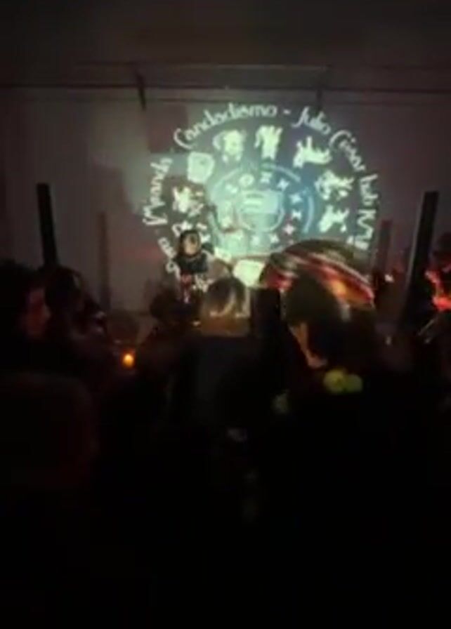 The scene shows a DJ performing in front of a crowd in a dimly lit space. The DJ is positioned at a DJ setup, with a projection screen behind them displaying various images and text, including the word "Candomblismo." People stand around the DJ, some holding phones, recording or taking photos. The room has a low ceiling and appears to be a converted industrial or commercial space. The lighting is focused on the DJ and the projection, creating a club-like atmosphere. The video is shaky, as though it was filmed with a cell phone.