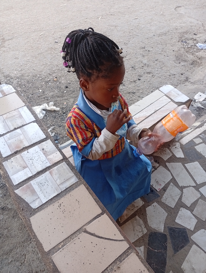 A young girl sits on a mosaic-tiled step, wearing a blue dress and a colorful plaid shirt over a white undershirt. Her hair is styled in braids with colorful beads. She holds a plastic bottle in her right hand and appears to be drinking from a small bag in her left. The step is bordered by brick, and the ground nearby appears to be concrete. The scene is captured from a high-angle view.