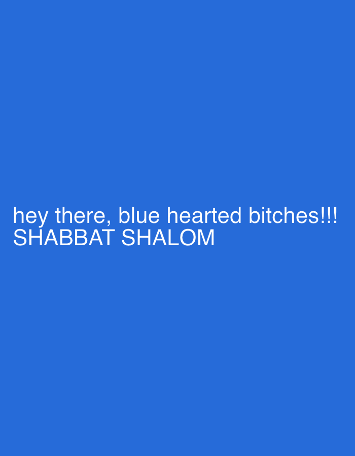 The image displays a solid blue background. White sans-serif text is present in the lower-middle portion of the frame. The text is arranged in two lines. The first line reads: "hey there, blue hearted bitches!!!". The second line, positioned directly below the first, reads: "SHABBAT SHALOM". No other subjects, objects, or environmental details are discernible within the image. Location: City of Unknown, Unknown.