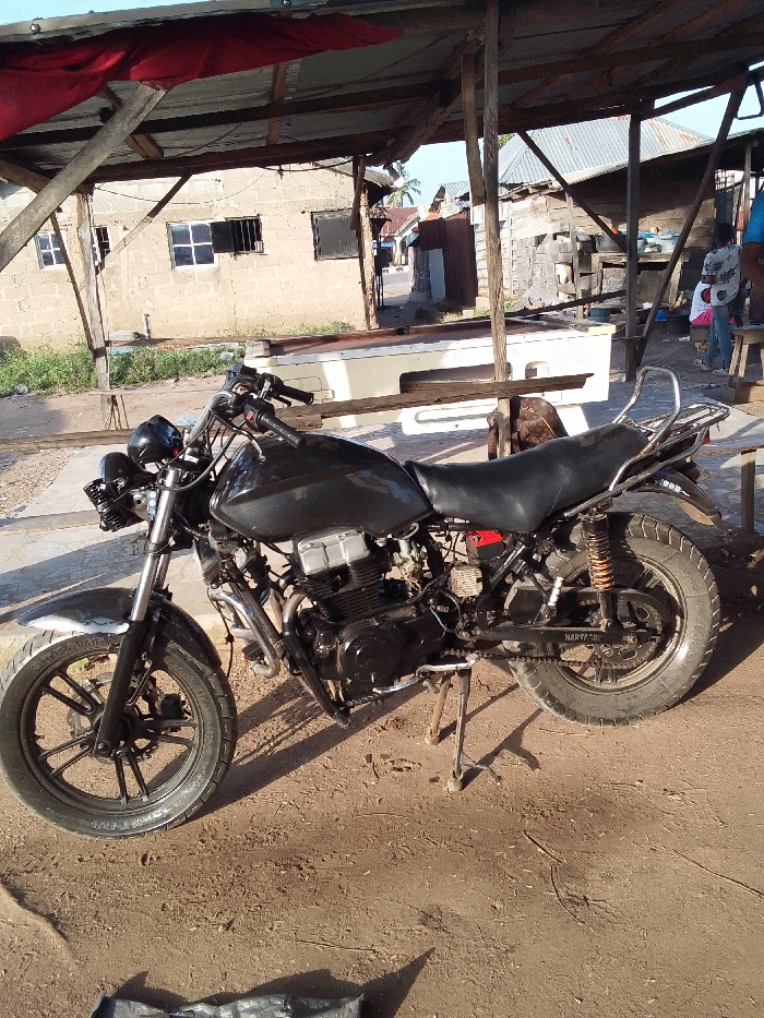 - "A black motorcycle is parked on its kickstand on a dirt ground under a rudimentary open-air shelter, which consists of wooden posts, corrugated metal roofing, and a red fabric strip" by FM-ykStB2, licensed under CC BY 4.0