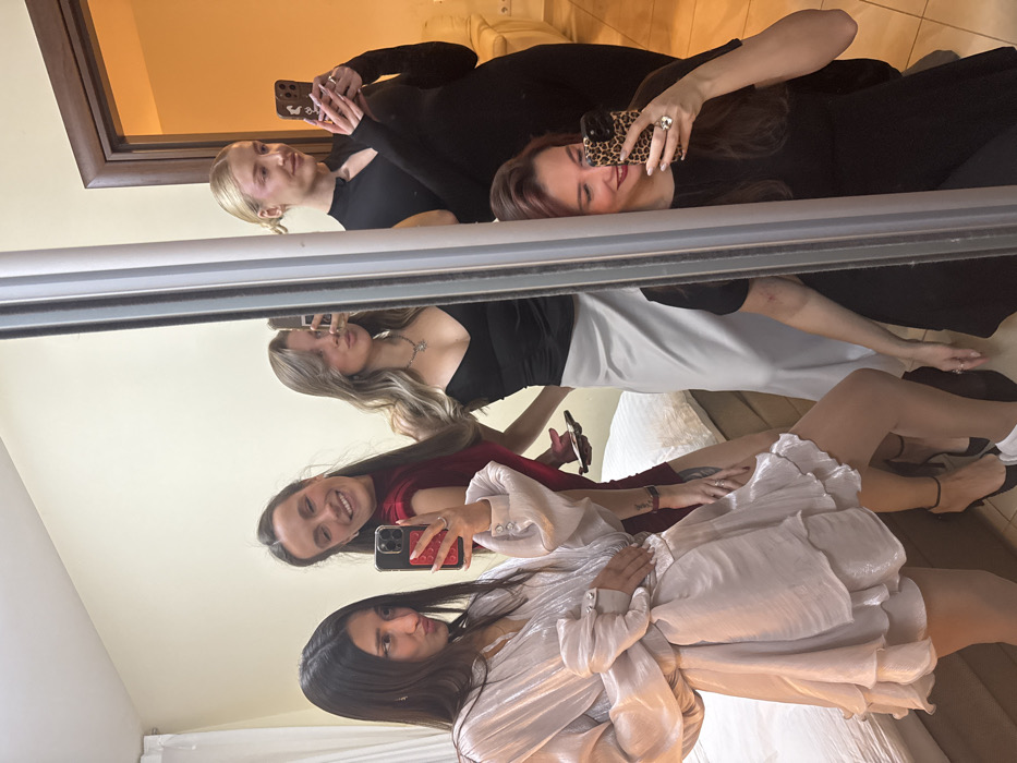 Four young women pose in front of a mirror, each holding a phone. The top row includes a blonde woman in a black outfit and a woman with auburn hair holding a leopard print phone case, both reflected in the mirror. The second row reflection shows a woman in a black top and white skirt, plus a woman in a red dress. The foreground shows a smiling woman in red and a woman in a beige dress. The reflection reveals the room behind them, including a couch.