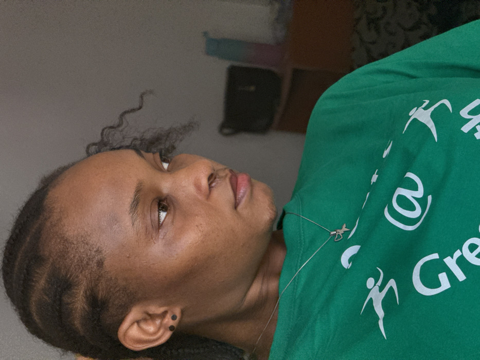 The scene depicts a single adult female in an indoor setting in Abuja, Nigeria. The subject, positioned with her head and upper torso visible, has dark skin and her hair styled in braids, with some loose, curly strands on the right side of her head. She wears small, round, black stud earrings in both ears and a small, metallic nose ring. A thin silver chain necklace with a small, indistinct pendant (appearing as a stylized figure with a heart) is worn around her neck. She is dressed in a vibrant green t-shirt featuring white graphics, including a stylized running figure, an "@" symbol, and partial text segments "Gre" and "th". Her gaze is directed off-frame to the right and slightly downwards. The background is out of focus, showing a light-colored wall. Visible within the blurred background on the right side are a dark, rectangular object, possibly a bag or piece of furniture, and a cylindrical object displaying a blue-to-pink gradient, consistent with a water bottle or flask. No other individuals or direct interactions are observable within the frame.