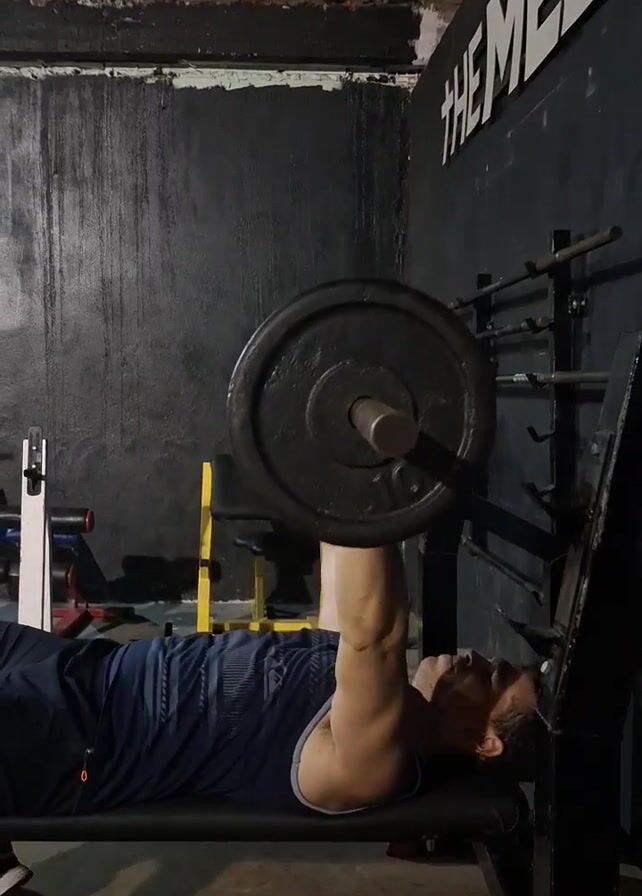 - "A man wearing a dark blue tank top and shorts is bench pressing a barbell in a gym" by FM-kzA8r2, licensed under CC BY 4.0