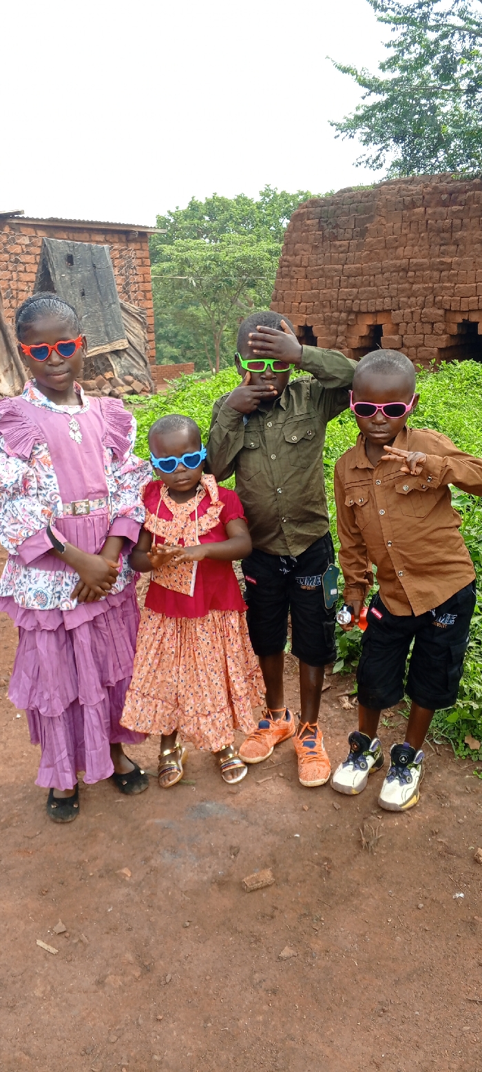 The image captures four children posing outdoors on reddish-brown dirt ground in Fizi, Democratic Republic of the Congo. The sky is overcast and white. On the left, a girl in a long-sleeved purple dress with white and purple floral patterns and a light brown belt holds the hand of a younger girl beside her. She wears black ballet flats and red heart-shaped sunglasses with small wings, looking directly at the camera with a slight smile. The younger girl, positioned centrally, wears a red short-sleeved top with ruffles and an orange floral-patterned skirt, complemented by gold sandals. She has blue heart-shaped sunglasses with small wings and her hands clasped in front, looking downwards. To her right, a boy in a dark olive green long-sleeved button-up shirt and black cargo shorts with white lettering covers his face with one hand over bright green sunglasses, while the other hand performs a gesture near his mouth. He wears orange athletic shoes. The fourth child, another boy on the far right, wears a brown long-sleeved button-up shirt and black cargo shorts with white lettering. He wears pink sunglasses and holds a small, silver cylindrical object in his right hand, while his left hand is raised in a gesture. He wears white and black athletic shoes. In the background, two rudimentary structures constructed from reddish-brown bricks or mud bricks are visible. The structure on the left has a partial corrugated metal roof and what appears to be wooden planks covering an opening. The structure on the right is a bare brick wall. Lush green trees and bushes are present behind the structures and to the right. The ground is scattered with small debris, including pieces of wood and what resembles a corn cob.