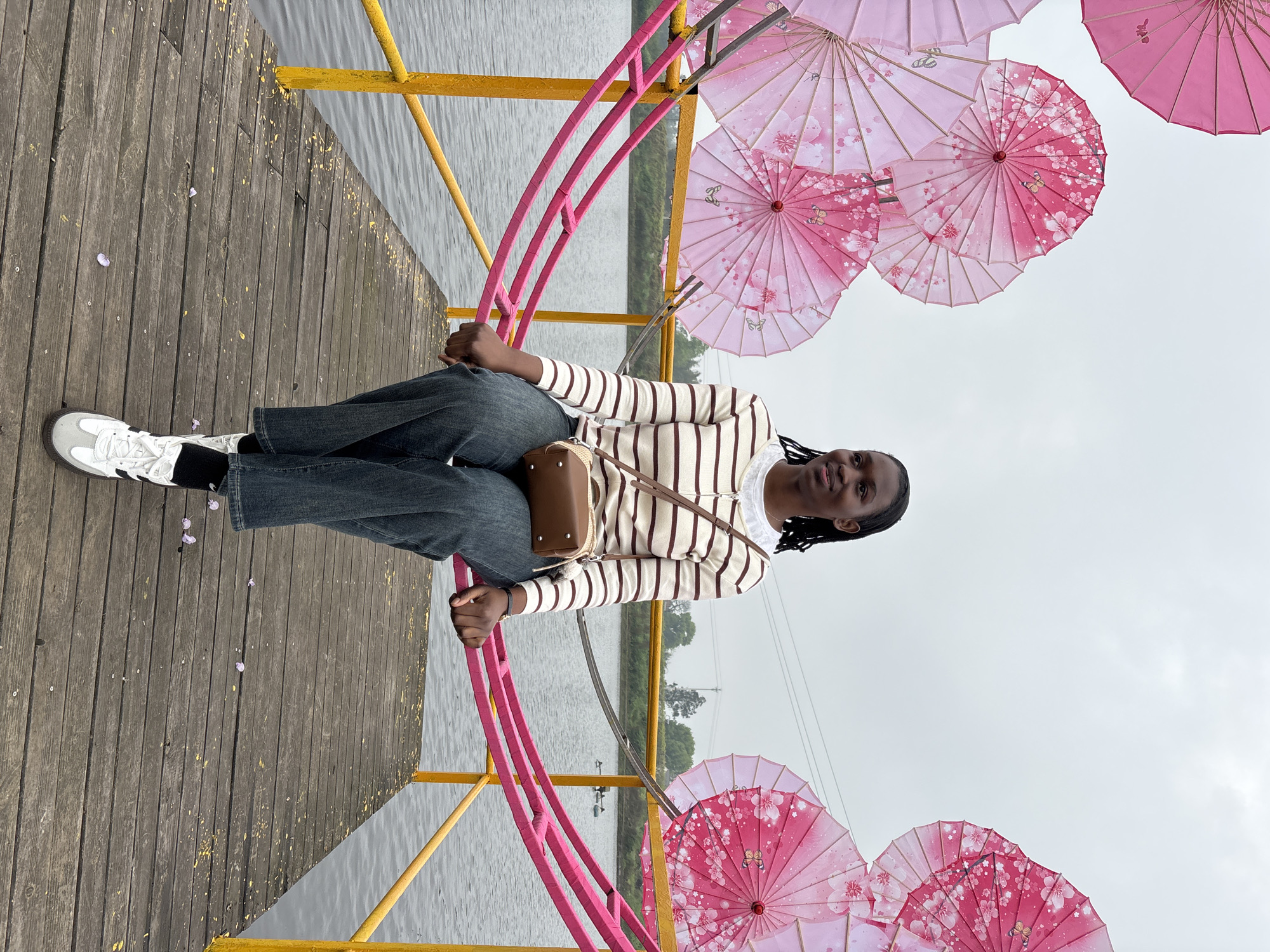A young Black woman sits on a wooden platform in Xianfeng, China, framed by pink decorative umbrellas and water in the background. She wears a striped shirt, jeans, and white sneakers with black socks, and carries a brown shoulder bag. The platform has a yellow and pink railing. Cherry blossom petals are scattered on the platform. The sky is overcast.