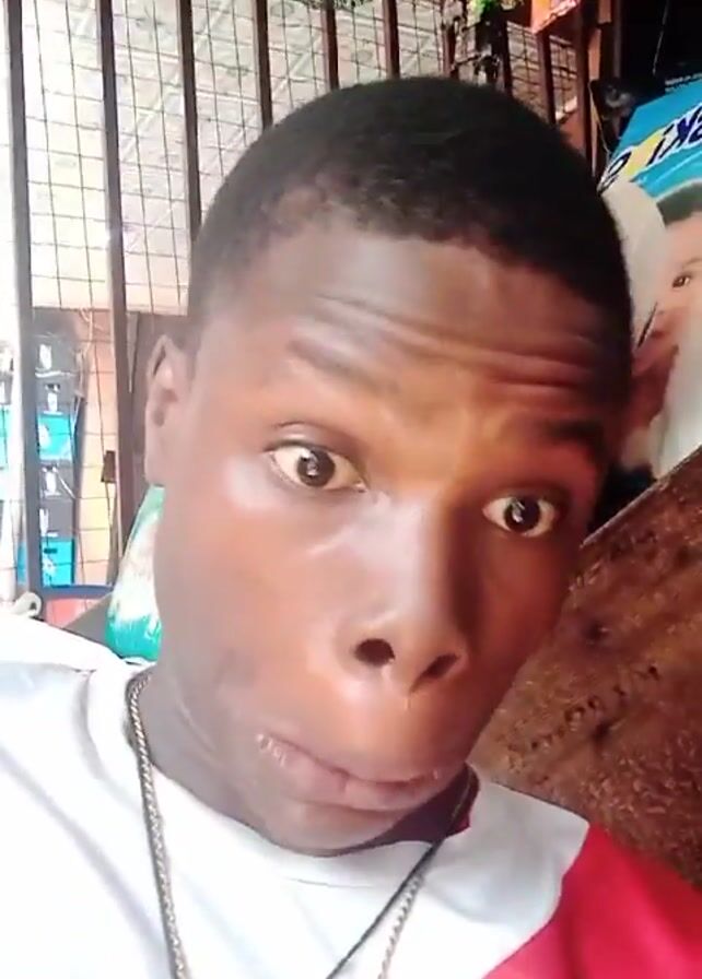 A person is the sole focus of the video. The individual has dark skin and short, dark hair. They are wearing a white t-shirt with red accents and a silver-colored chain. The person makes exaggerated facial expressions with wide eyes and shifting eyebrow positions. The background is busy and appears to be an enclosed space, potentially a shop or kiosk. The walls and shelves are cluttered with various items, including snacks, bags, and other merchandise. Metal bars or grates are visible, along with a green net-like object hanging above. The lighting is moderately bright. The camera is static and at eye level, capturing a close-up view of the person's face.