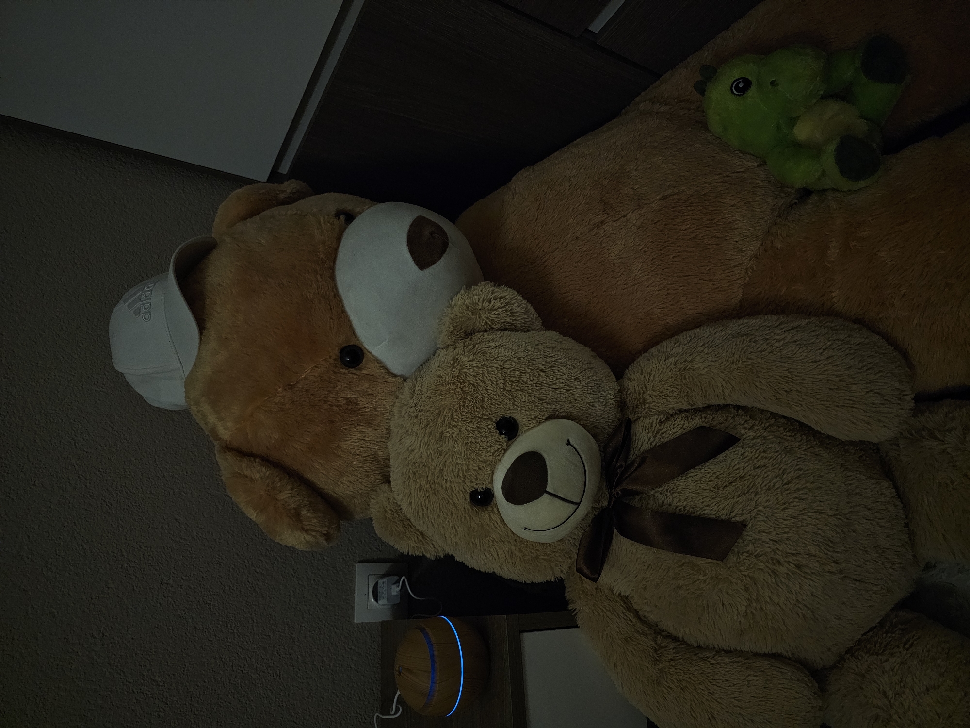 scene inside a room, likely a bedroom, in an unknown location (Plovdiv, Bulgaria, is irrelevant based on the image). A large teddy bear with a white Adidas cap on its head is visible, with a smaller teddy bear resting on it. A small green stuffed toy is positioned on the larger bear. A wooden and white bedside table is located near the bears, holding a diffuser with a blue light. A wall outlet with a plug is partially visible near the table. The room appears dimly lit.