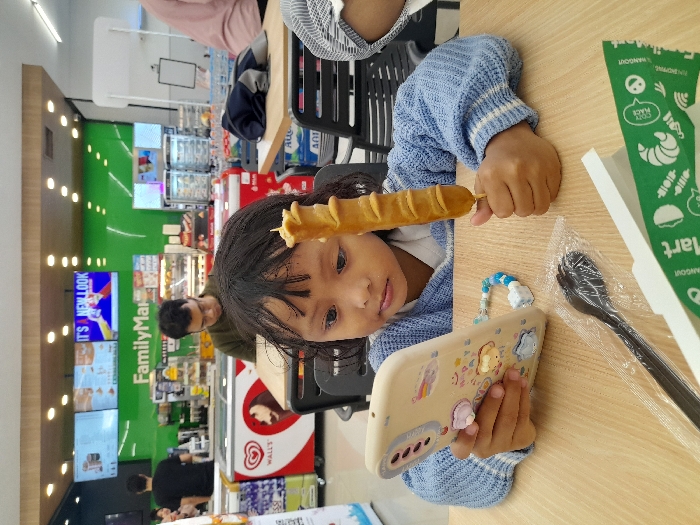 A young child in a blue sweater holds a corn dog in one hand and a phone in the other. The phone has a cream-colored case with cartoon characters. A black plastic spoon and fork are beside a green and white box. The child is seated at a table, inside a FamilyMart convenience store. In the background, there are store shelves, coolers, and other shoppers.