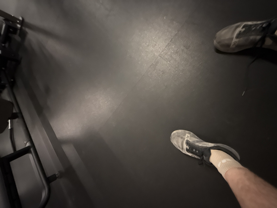 The image displays a first-person, downward view of a person's feet positioned on a dark, tiled floor, consistent with an indoor gym environment located within West Suffolk, United Kingdom