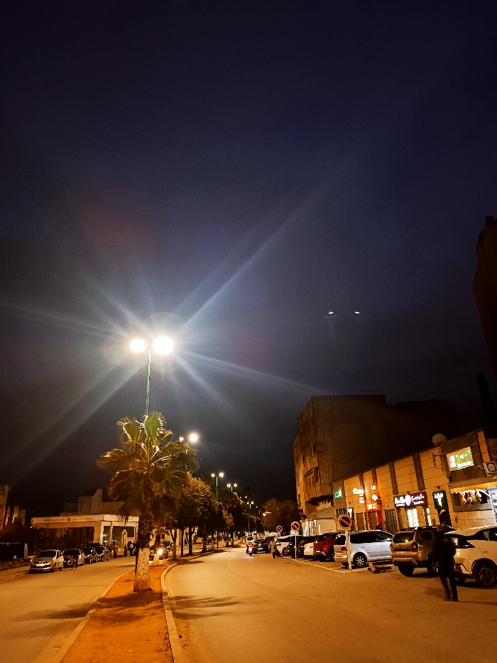 A nighttime street scene with warm artificial light illuminating buildings and parked cars. A palm tree stands beneath a bright streetlamp. The sky is a deep blue, almost black, with two small green lights visible in the distance. The road is empty except for a few cars and a pedestrian on the right. The overall impression is peaceful and quiet.
