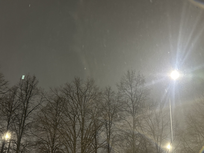 This image depicts a nocturnal scene in Naberezhnye Chelny, Russia, during what appears to be falling precipitation. The sky is dark and overcast, partially illuminated by artificial light sources. A dense row of leafless deciduous trees occupies the lower half and midground, their bare branches silhouetted against the sky. A prominent, intensely bright streetlamp on a pole is positioned on the right side of the frame, emitting a strong starburst effect and significant light scatter, likely due to atmospheric moisture or camera lens interaction. A dimmer, obscured light source is visible on the far left, with another faint light present near the bottom center. Numerous small, bright specks, consistent with illuminated snowflakes or raindrops, are visible throughout the frame. In the upper-left quadrant, a small, rectangular, light-green luminous object or reflection is present. A faint, vertical, bright streak is discernible in the upper-right area of the sky. No human figures, animals, or vehicles are visible.