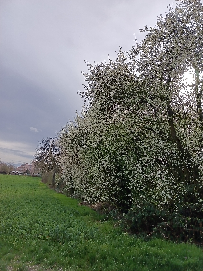 This image depicts an outdoor landscape in Hoenheim, France, under an overcast sky with patches of brighter light visible through clouds in the upper right. The scene is dominated by a wide expanse of green grass and low-lying vegetation in the foreground and extending to the left mid-ground. To the right, a dense line of deciduous trees in full white blossom stretches from the mid-ground towards the background. The trees exhibit dark brown trunks and branches. Below the blooming trees, a thick undergrowth of green shrubs and tangled vegetation is present. In the distant left background, a cluster of light-colored multi-story buildings, likely residential, is visible against the horizon, alongside smaller, single-story structures closer to the field's edge. No people, animals, or specific man-made objects are visible in the immediate foreground or mid-ground.