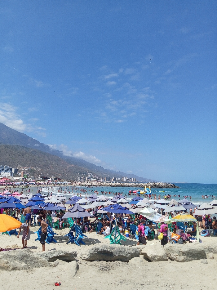 - "The image depicts a crowded beach scene in Caraballeda, Venezuela, under a clear blue sky with scattered light clouds" by FM-I9zNR2, licensed under CC BY 4.0