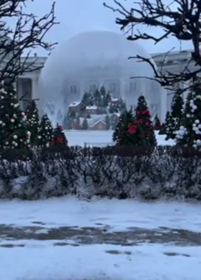 winter scene. In the foreground, there's snow on the ground and bare bushes. A row of decorated Christmas trees are interspersed with the bushes. Behind them is a large, transparent dome enclosing a miniature village scene, complete with small houses and trees. The dome is situated in front of a white, grand building with classical columns. The sky is overcast, creating a flat, grey light. The scene is framed by bare tree branches on either side.