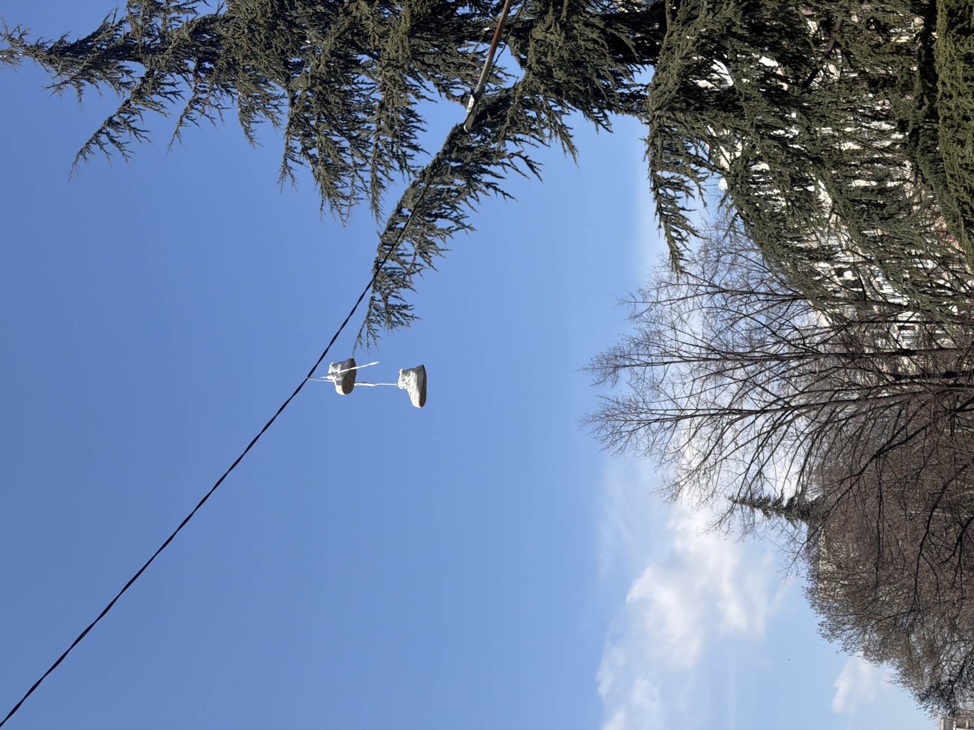 An outdoor scene in Burgas, Bulgaria, depicts a pair of light-colored sneakers suspended by their laces over a taut, dark-colored overhead cable, positioned against a clear blue sky. The cable runs diagonally from the upper left to the lower right of the frame. A large evergreen tree with dense, dark green needles occupies the right side of the image, with some branches extending near the cable. In the lower and left background, several leafless deciduous trees are visible, behind which portions of light-colored buildings with multiple windows are discernible. A few small white clouds are present in the lower-left sky. No individuals or active interactions are depicted.