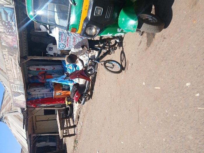 The image depicts a bustling commercial street scene, likely in Jos, Nigeria, under bright daylight. In the foreground, a young male, appearing to be a child or adolescent and wearing a light-colored shirt and dark pants, is positioned centrally, bending down and interacting with a blue bicycle. To the far right, the front wheel and green fender of a green and yellow motorized tricycle (keke Napep) are visible. A red scooter with a dark, textured seat is parked on the left side of the unpaved, reddish-brown ground, which is scattered with debris. In the background, several single-story structures with corrugated metal roofs line the street. The most prominent building features a sign that reads "AIMS GLOBAL". Various fabrics and garments in colors such as red, white, and blue are displayed outside this establishment. An adult male, wearing an orange top and a head covering, is visible inside the "AIMS GLOBAL" shop entrance, handling a light blue patterned fabric. To the left of "AIMS GLOBAL", a rustic wooden table stands. To its right, a blue and white sign for "KAJIMA COLD KILLER" is prominently displayed. The scene is illuminated by strong sunlight from the upper right, casting distinct shadows and creating lens flare.