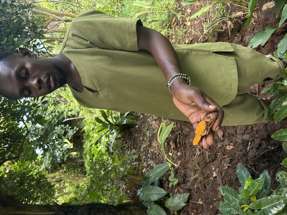 The scene depicts an outdoor, densely vegetated environment in Kendwa, Tanzania. An adult male with a dark complexion, short hair, and a beard stands in the foreground. He is dressed in an olive-green short-sleeved tunic with a notched collar and matching cropped trousers. A multi-strand metallic bracelet is worn on his left wrist. In his left hand, he holds a turmeric rhizome, which is broken to reveal a vibrant orange-yellow interior and visible root structures. His gaze is directed downwards towards the item he holds. The ground directly surrounding him is dark brown, exposed soil, interspersed with various green broad-leaf plants. The background consists of lush tropical foliage, tall trees, and dense greenery. A light-colored, rustic building with a dark roof is partially visible in the distant background, obscured by the vegetation.